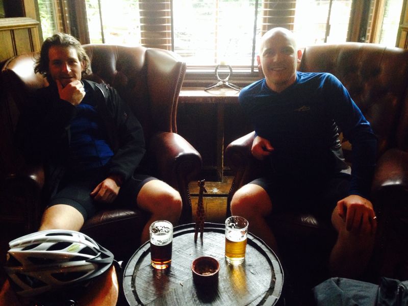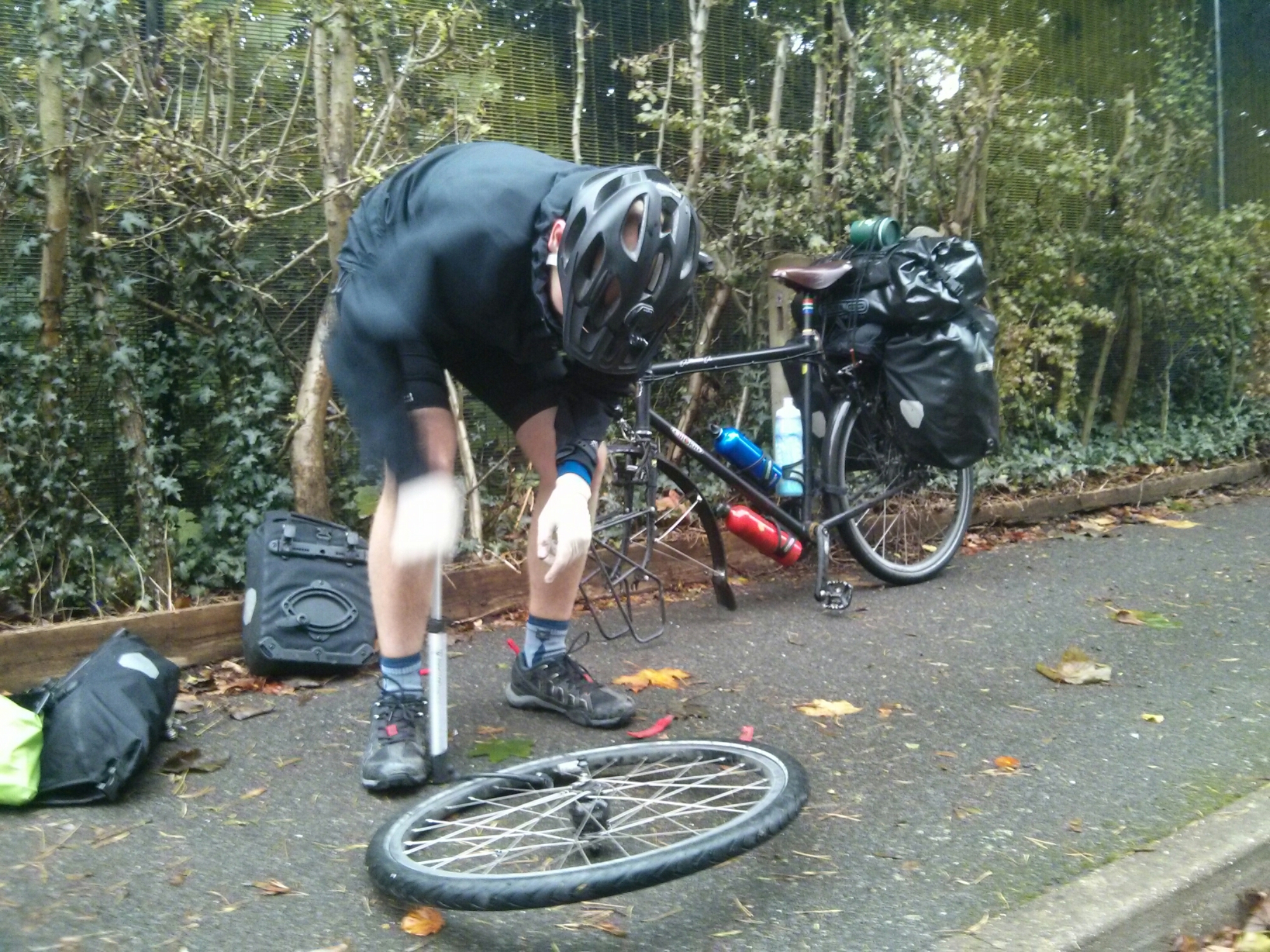 We pushed on and found the Pilgrim’s Way which is a beautiful ride but rather hilly and in hindsight we should really have stuck to the A20. We clocked extra unnecessary mileage which included a massive climb on a detour of a muddy section of the trail. Pierre’s knee started to play up and we required frequent rest stops. One which included the first puncture of the trip (Pierre’s front tyre). Another where we stopped at The Cock Horse Inn in Detling for a pint and had some magic pork scratchings whilst sitting in a very comfortable armchair. It was tough to return to the Brooks saddle and ride on in the rain.